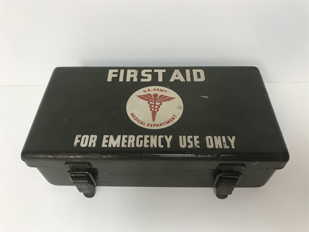 Metal box (no contents) in good general condition, a WWII era military item.  Includes first aid info inside the lid.