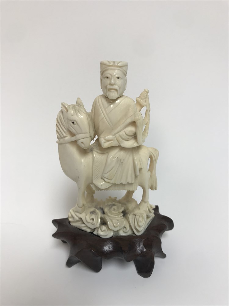 Unusual snuff bottle in the form of a man riding a horse.  Carved antique pre-ban ivory figure attached to a wood base, total height approx. 4.5".  The man's head lifts off and has a small spoon (photographed).  Great details, and a must-have addition to a snuff bottle collection.