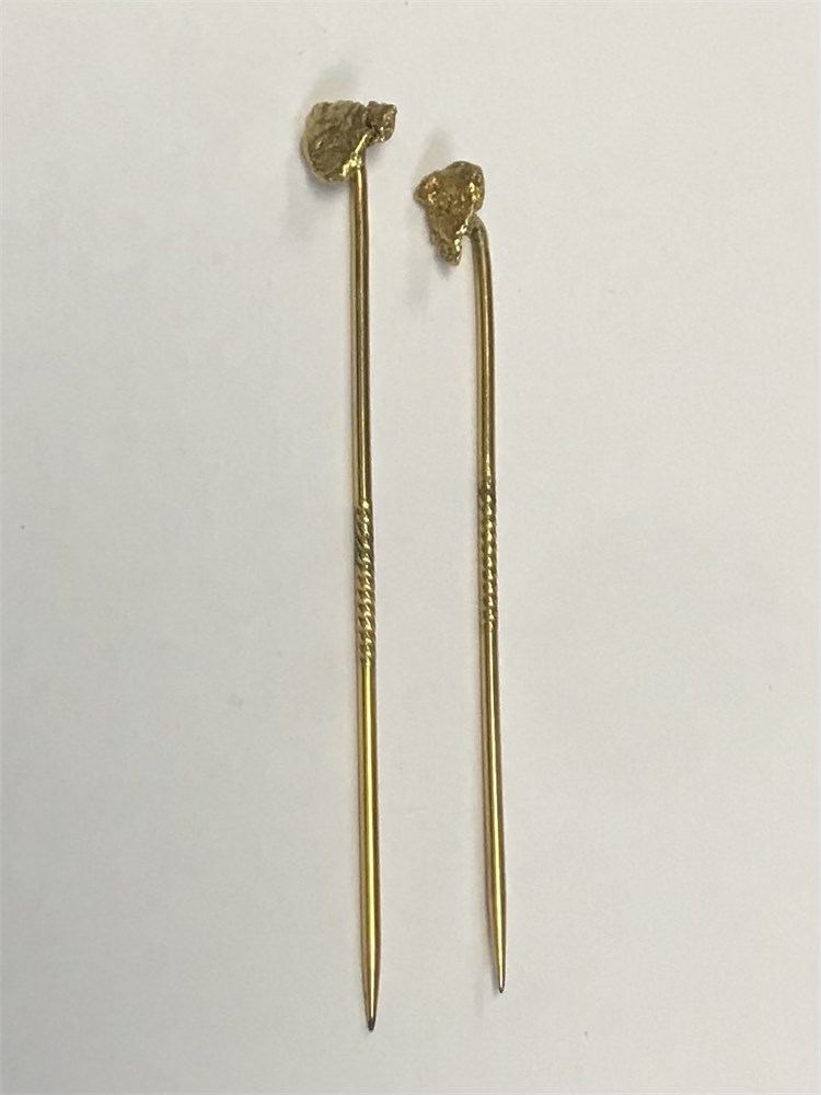 Pair of natural nugget stickpins, unmarked, they test 10-14K gold.