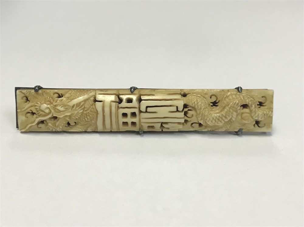 2.75" long hair barrette, pre-ban antique ivory carved with a dragon and other details.  Stamped "Silver" on the back.