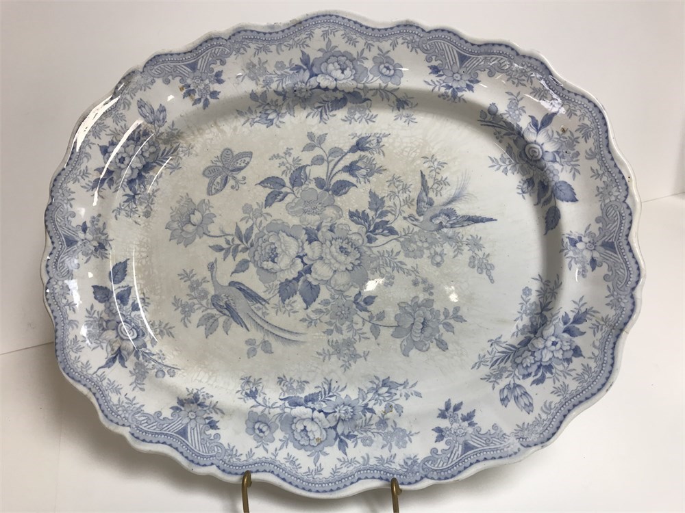 Circa 1890 meat platter by Wedgwood, Asiatic Pheasants pattern.  This platter shows its age with crazing and a couple light hairlines, and of course the discolored back, see pics.  Still a pretty piece.