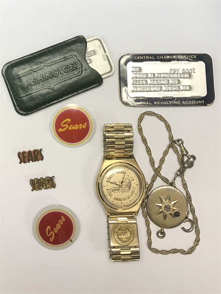 Men's Accutron watch commemorating State Farm Insurance 50th Anniversary 1979.  Sears sales pointer watch fob, Sears pins.  2 old fashioned metal "charge plates" - the forerunners of credit cards.