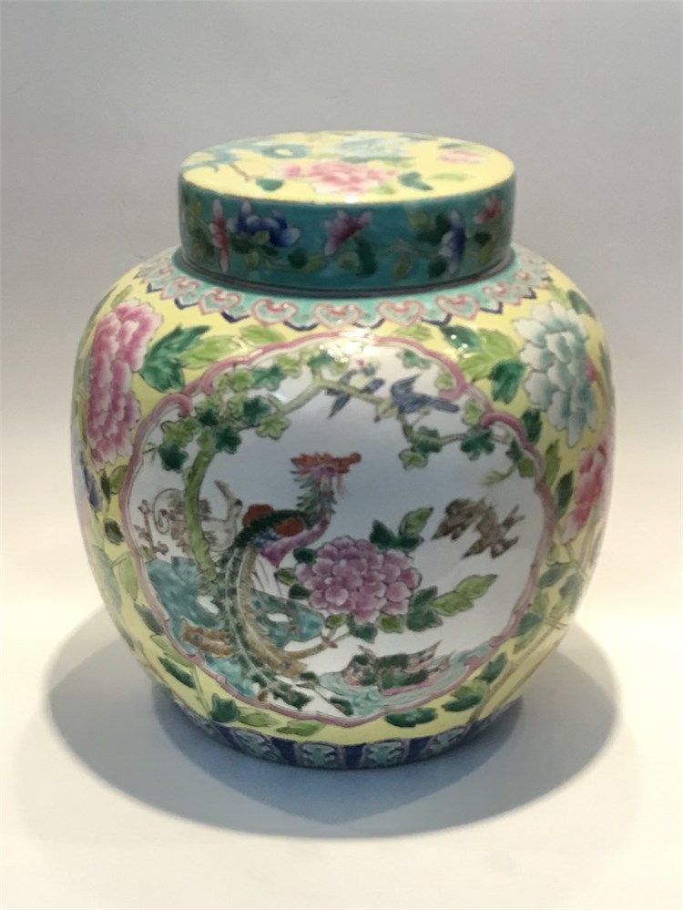 Very nice ginger jar with lid, hand painted with birds and branches.  Bottom has a red stamp/signature, see photo.  Good condition, no chips or cracks.