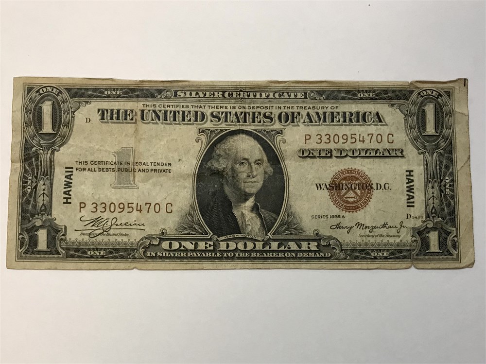 1935 Hawaii silver certificate, red seal, series 1935 A.  Condition includes folds and pinholes, see photos for details.