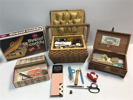 Everything sewing-related from the estate.  A sewing box with contents, a thread caddy with contents, a cigar box with a few items, a nice wood Garcia cigar box with several sewing notions in it.  Plus scissors and a great old pair of Wiss Pinking Shears with box.  Also I see an antique thimble!