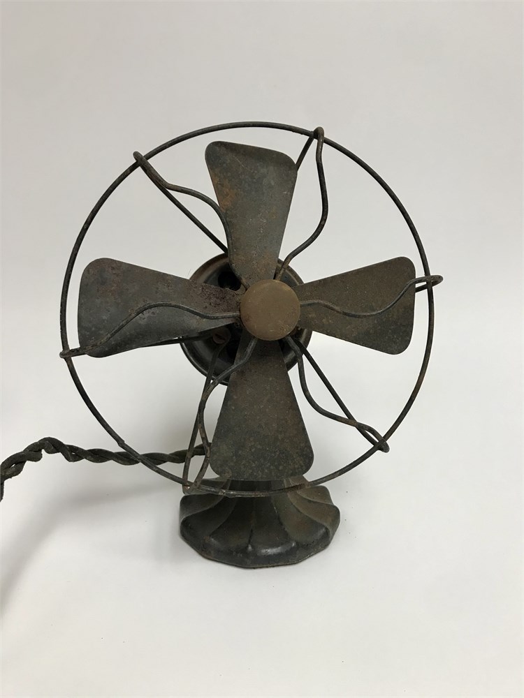 Old electric desk fan with cast iron base.  This one is interesting because it's smaller than most.  About 8" tall.  Maker's clues in the photos!