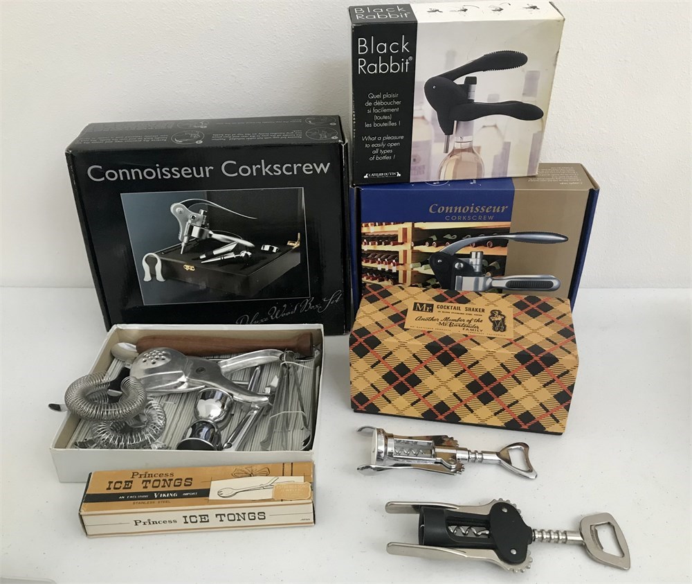 Wine and bar accessories, older and newer.  It's interesting that the vintage stainless steel ice tongs (still in box) were purchased from a JEWELER.  Certain items had such importance back in the day.