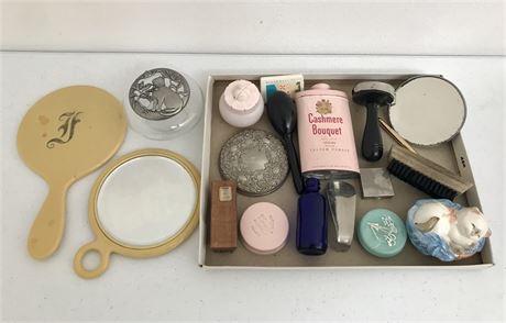 Cashmere Bouquet tin, sock darner, pill box, cream jar, celluloid mirrors, other mirrors, cobalt mini bottle, cat, more.