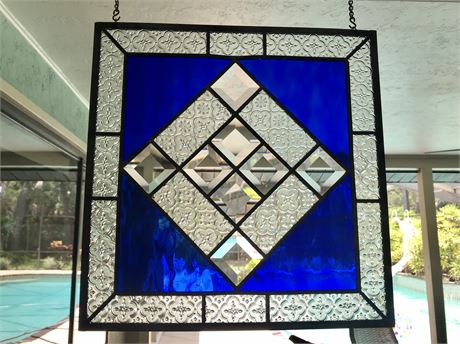 Leaded glass panel; it's quite pretty with a mix of beveled glass, pattern glass, and cobalt blue glass.  We do not have the chains for hanging, sorry.