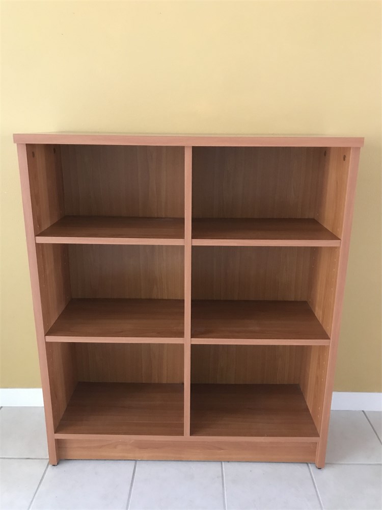 Bookshelf is currently configured cubby style, but the shelves are adjustable as you prefer.  Laminated particle board in good condition.