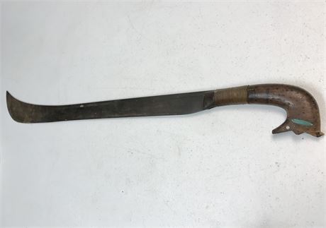 Made in England, a classic well marked Martindale machete.  Hard to find one like it.  It seems likely to me some WWII soldier made their own carved wood custom scales and wire wrap to make it their own.  Custom scales/handle have condition issues.  If you look closely the scales are covering the word England where it says "Made in ..." and I would be willing to bet there is a crocodile logo underneath too.  Check out the photos.