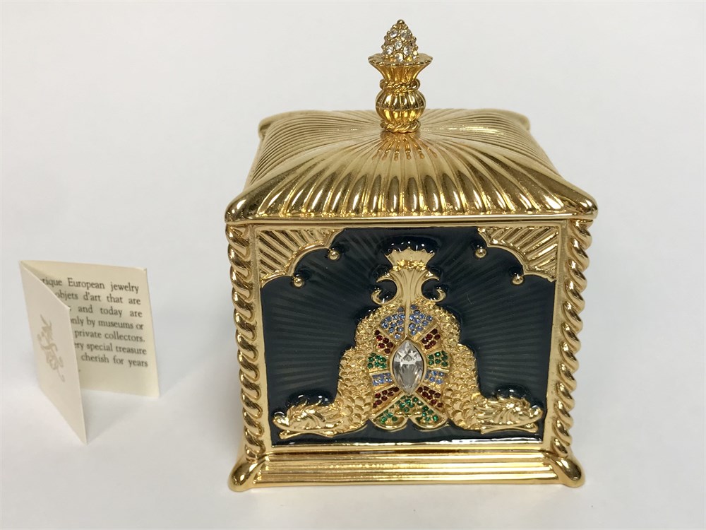 Wendy Reed boxes have a 22K gold finish, hand enameled with Swarovski crystals.  They're beautiful small boxes for special jewelry.