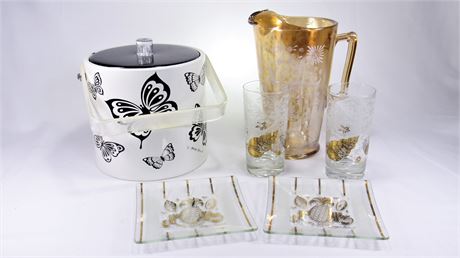Georges Briard Signed Ice Bucket, (2) Nut Dishes, (2) Shell Glasses and (1) Jeanette Glass Pitcher.  All in good Vintage Condition.