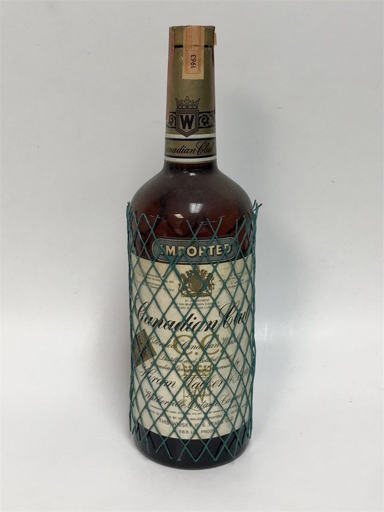 Collectible bottle of Canadian Club C.C. Whisky (unopened with contents considered inedible).  Tax seal is dated 1963.  See photos for more details.
