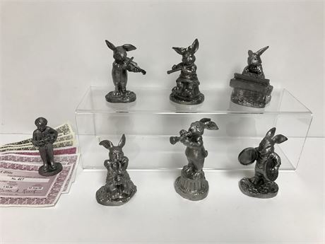 6 adorable bunnies playing instruments ... crafted in pewter by Michael Ricker.  They're signed and dated on the back and numbered on the bottom (one is pictured for example).  Plus, they each have a certificate.