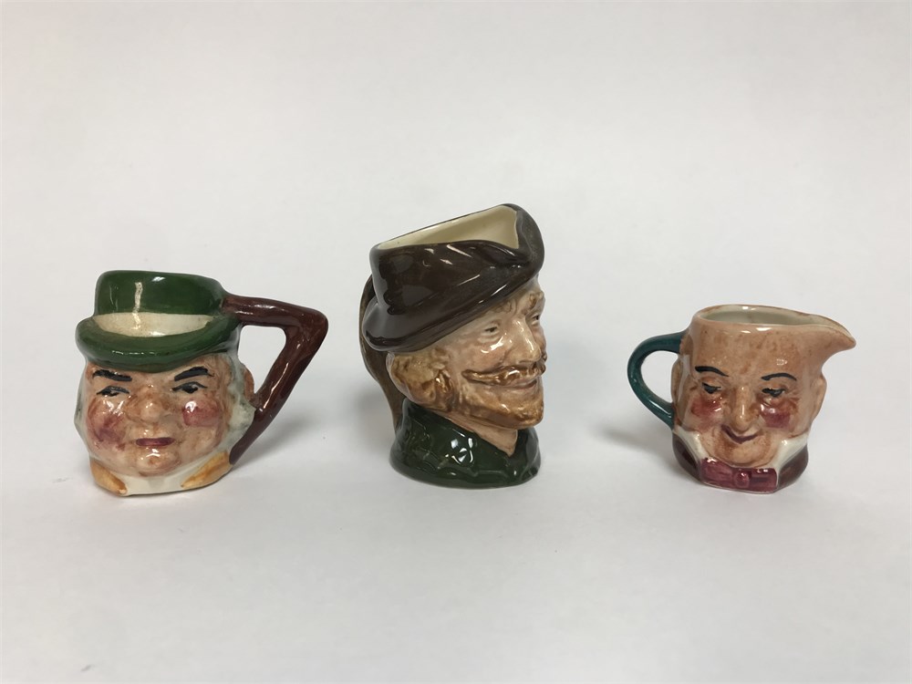 English toby mugs (jugs) 1.5-2.5" tall.  The biggest is Royal Doulton; the other two are Artone.