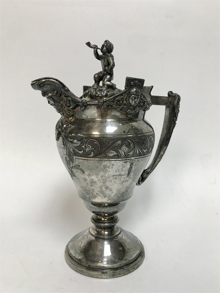 Intricately detailed silverplated 8" pedestal pitcher.  The lid has a boy on top blowing a horn, and there are other figures around the sides also.  The front is engraved Gavin? to Laura.