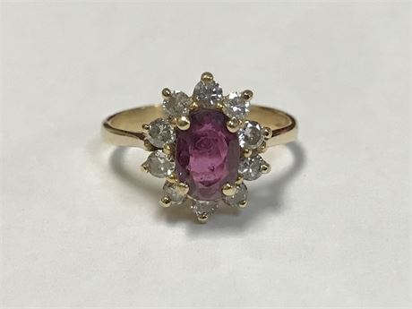 A small ring: pink topaz surrounded by genuine diamonds.