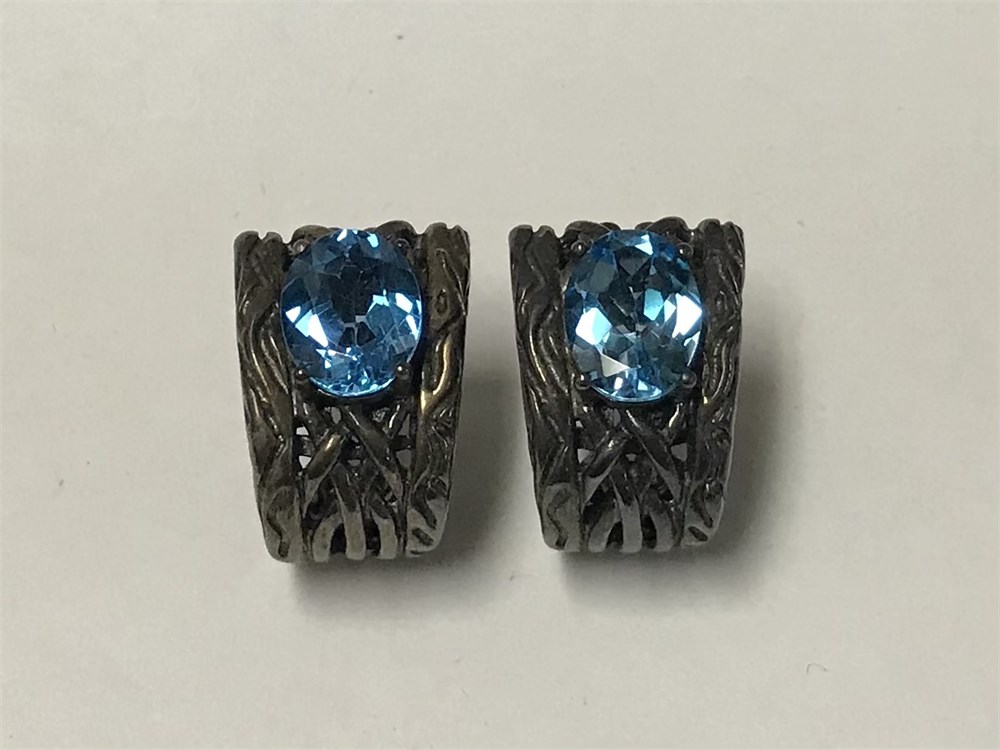Blue topaz earrings with character, designer Effy as pictured.  Marked 925, they're sterling silver.