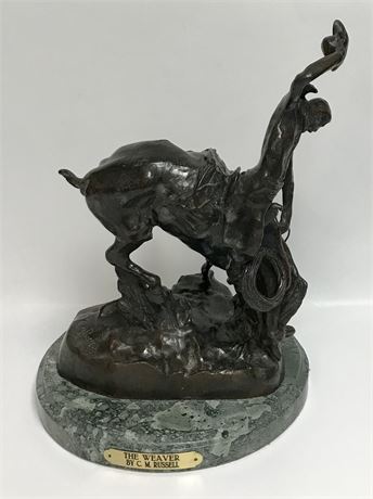 A great Western sculpture by C.M. Russell, a horse and rider cast in bronze (probably, non-magnetic metal).  Marble base with title: The Weaver.