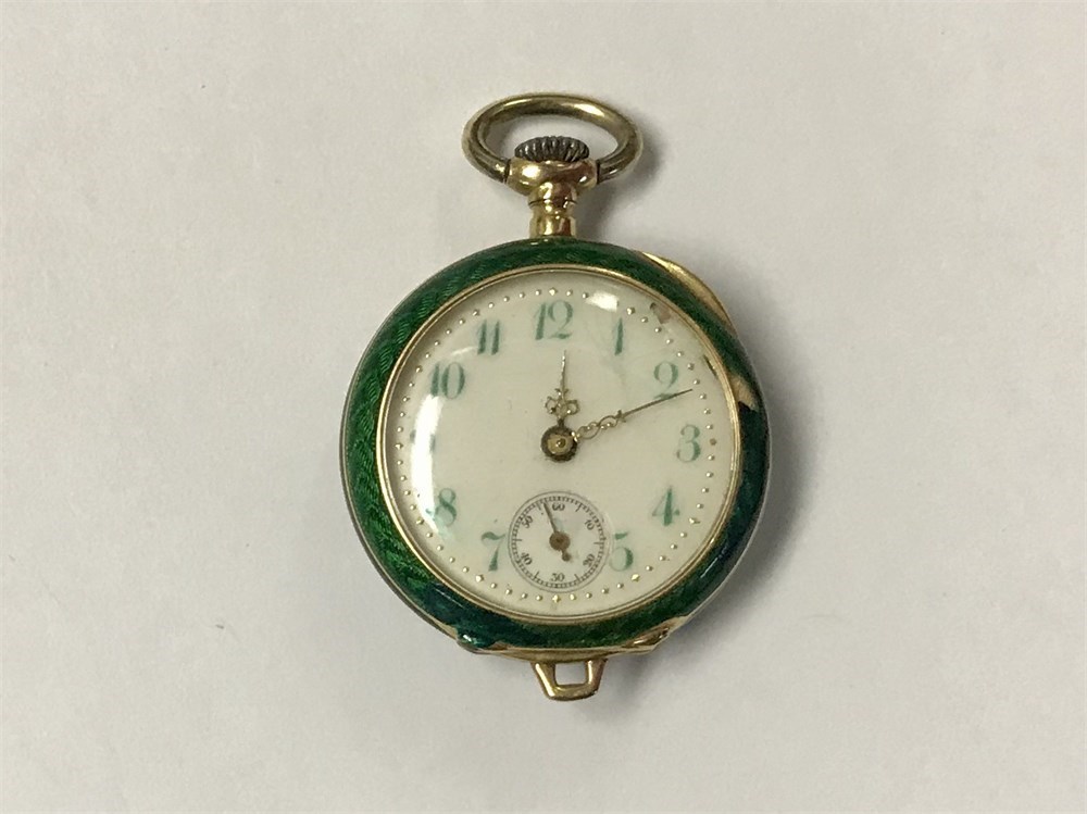 Swiss Enameled Ladies' Pocket Watch with Diamond, 14K Gold