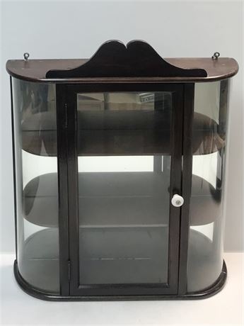 Antique wood cabinet with bow-front glass, made to hang on the wall, with mirrored back.  Good general condition, ready to hold your small collectibles.