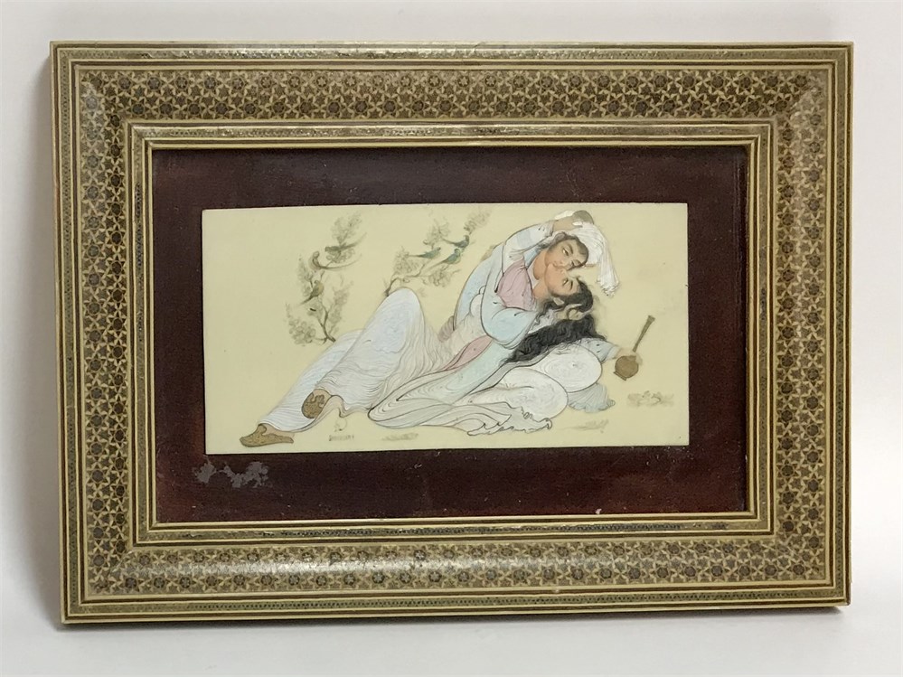 Indian or Persian Original Painting in Inlaid Mosaic Frame, Signed Badrosama