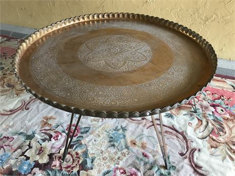 This is a consignment piece, with history of being used in the home of a foreign diplomat in the Middle East, who brought it back to the US.  The large 45" tabletop is heavy brass with piecrust edge and tooled design.  (The stand/legs are unattached and aren't brass.)  A really great piece for mid-century eclectic decorating.