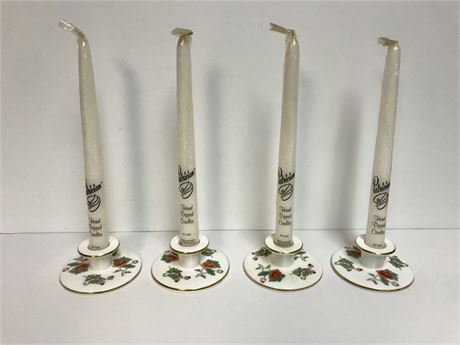 4 bone china candleholders, made in England, Wedgwood "Kutani Crane."  Good condition.  With 4 unused candles too.