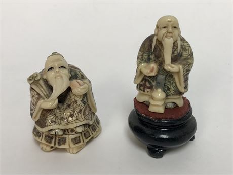 2 scholars, both holding a peach.  The larger one has a scroll also, and he's standing on a turtle.  The smaller netsuke has a wood stand.  Both are signed on the bottom, see pic.