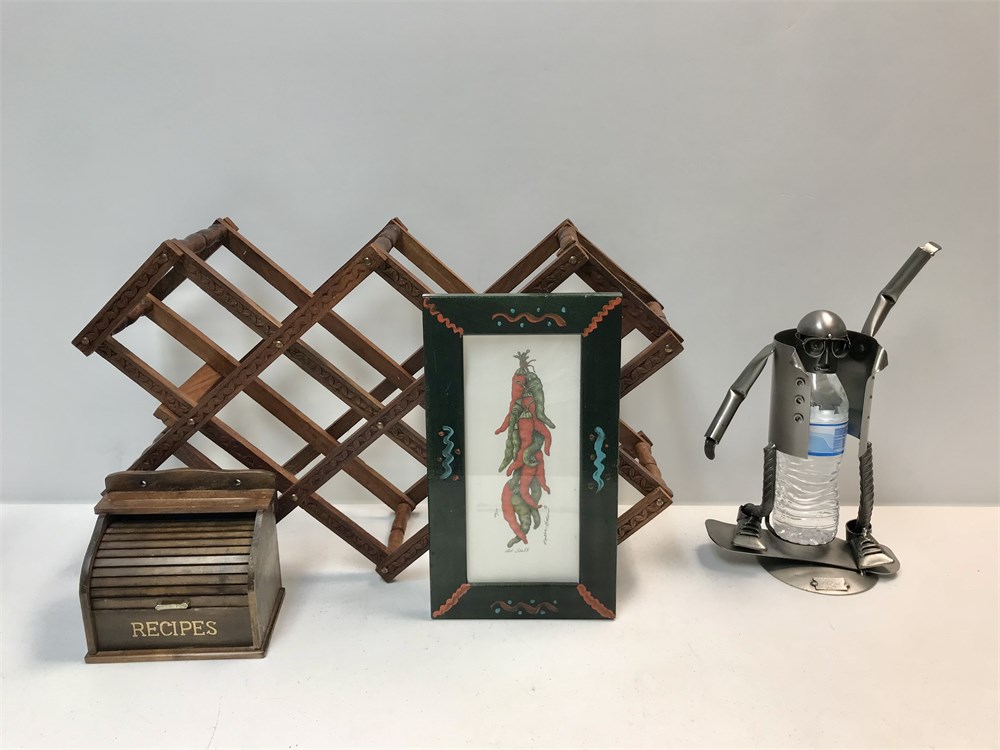 Kitchen items:  empty Recipe box, expanding wood wine rack, small chili pepper art.  And a nice metal sculpture by H&K, a wine bottle display.