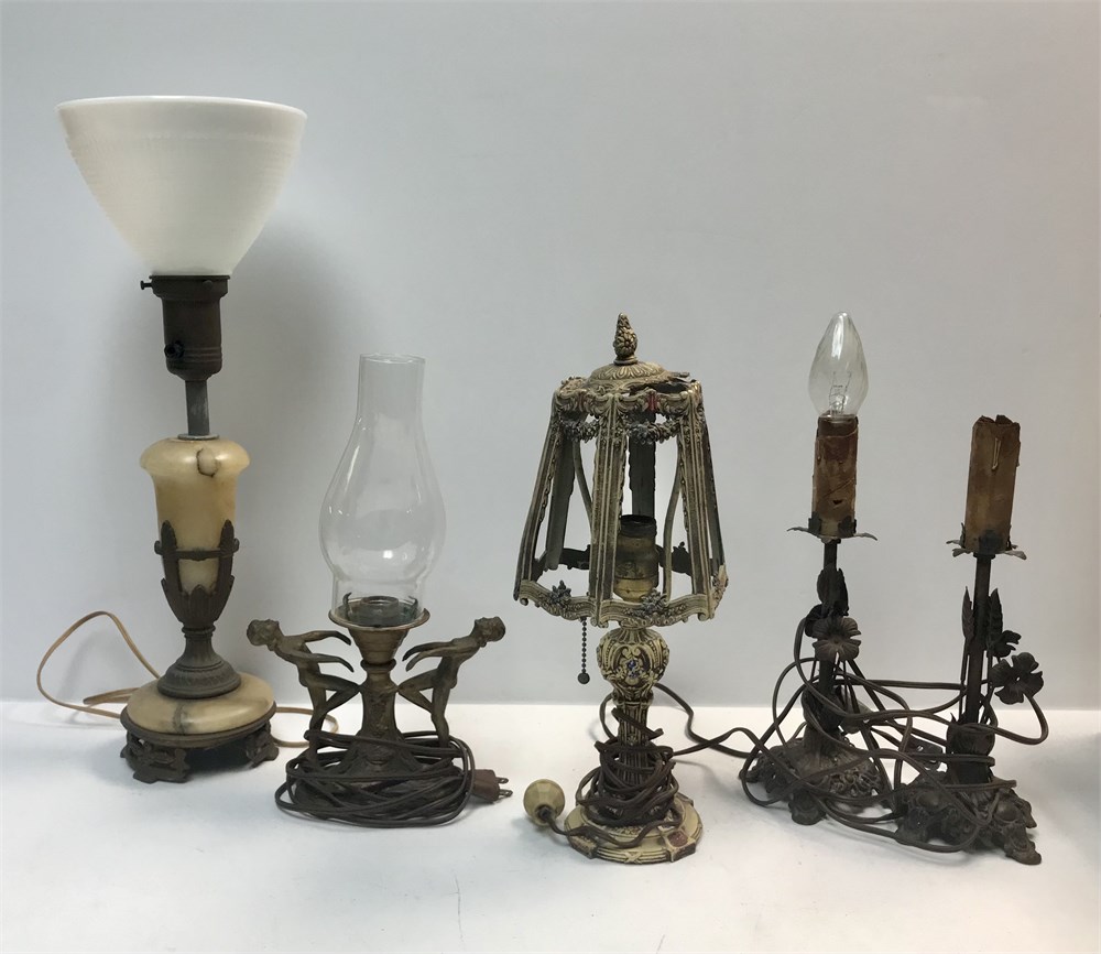 Last minute find from the garage.  Tall lamp with white shade has damage on metal base, not bad otherwise.  The lamp with 2 figures looks pretty good but the chimney doesn't fit it.  The floral lamp with metal shade has no fabric and some damage to the metal also.  The pair has cast iron bases.  All AS IS for a restoration project.
