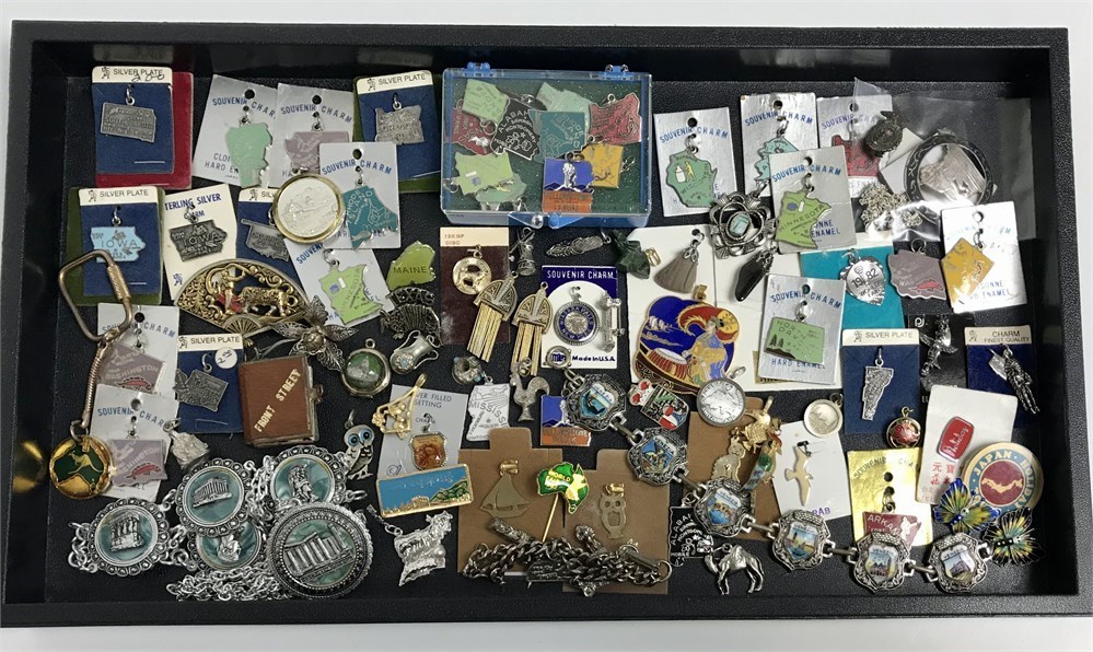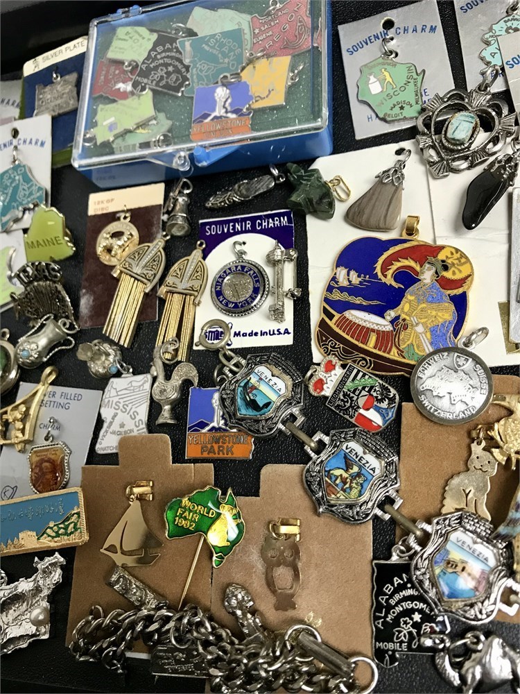 A collection of charms and other small trinkets from traveling, including many of the U.S. states.  A few may be sterling silver but most are plated or other materials.  Big group!  Charm bracelet, pins, pendants, etc.