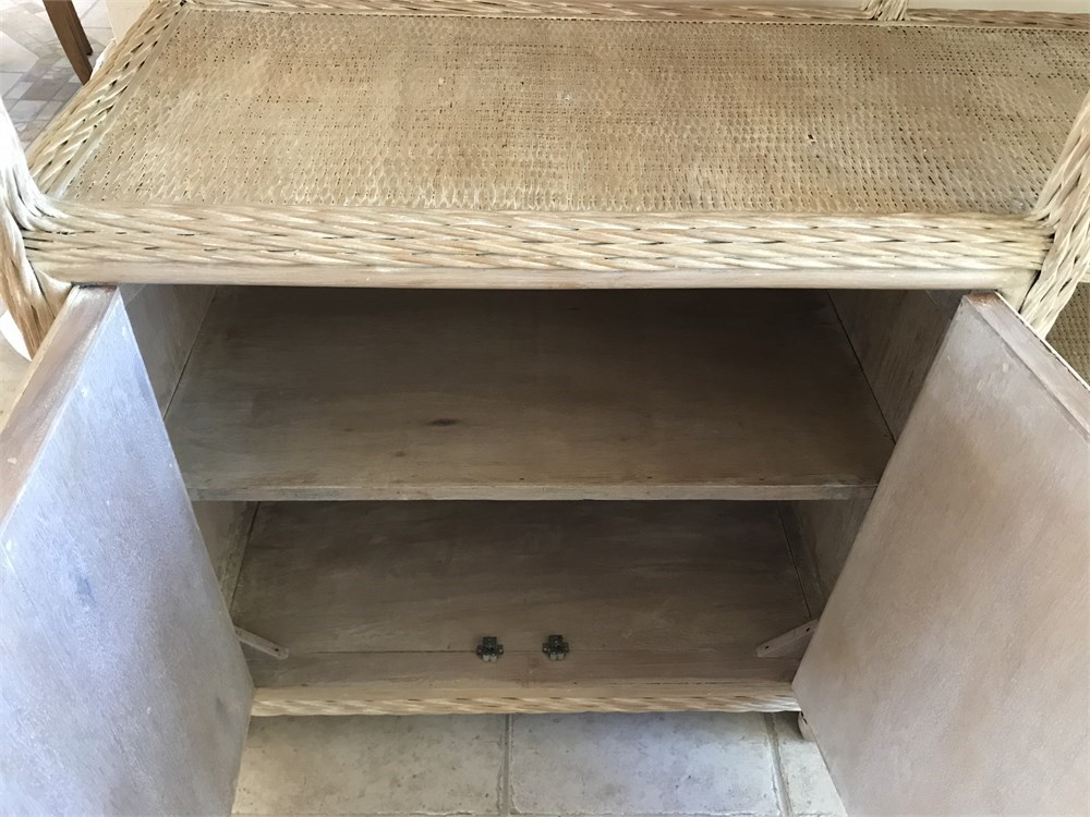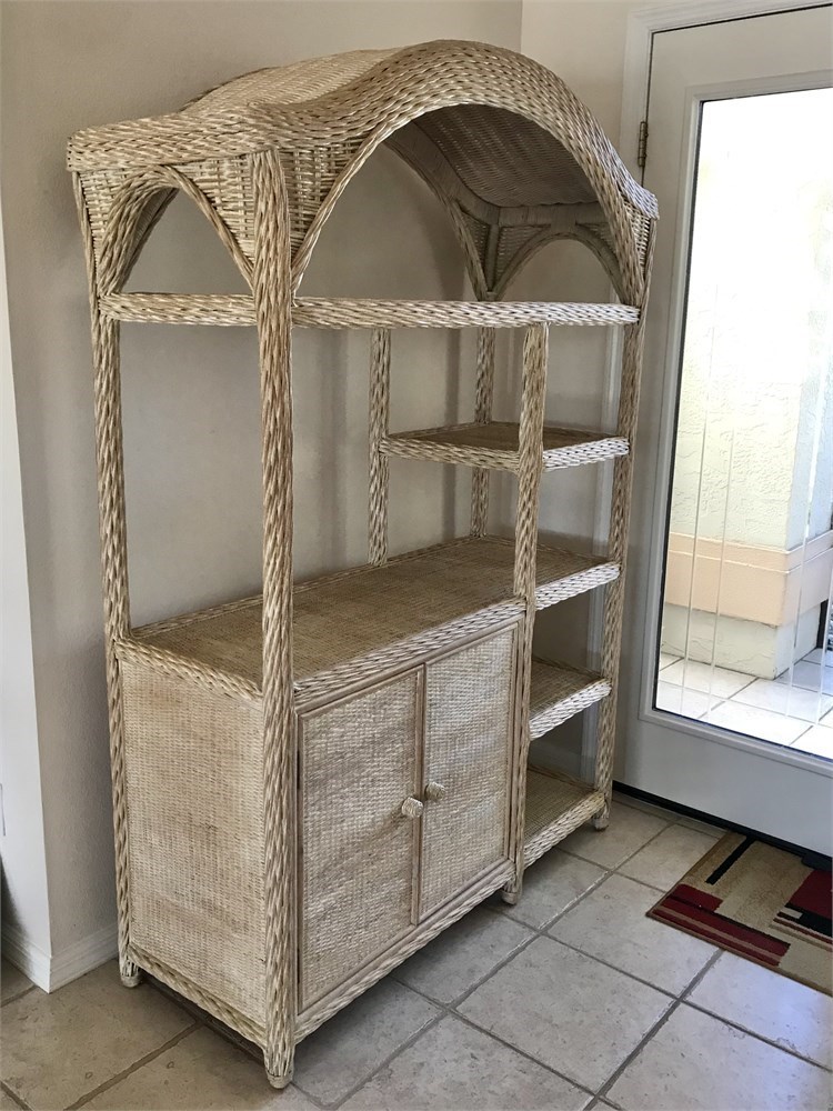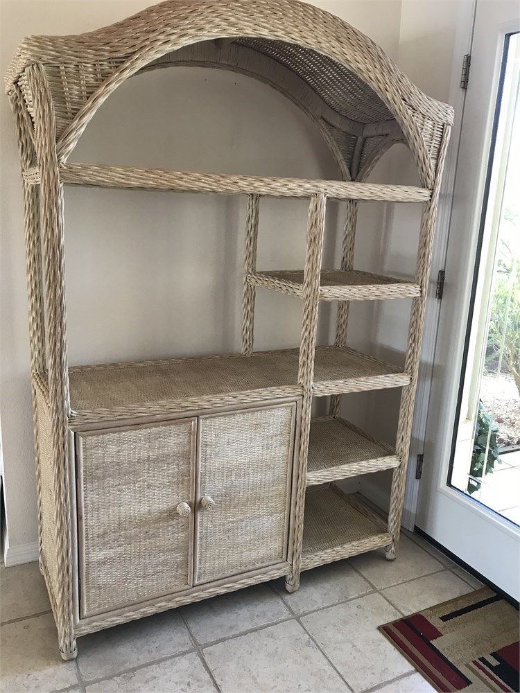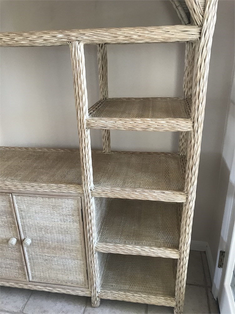 Attractive modern coastal style furniture piece for displaying and organizing at home, or even for retail.  Unit includes a cabinet and several shelves.