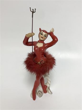 Rare mid-century figurine of a dancing lady in devil costume, complete with boa style tutu and a metal pitchfork.  We believe this is a Napco piece; it has a Made in Japan label.  No chips/cracks; see photo for details on the vintage condition.