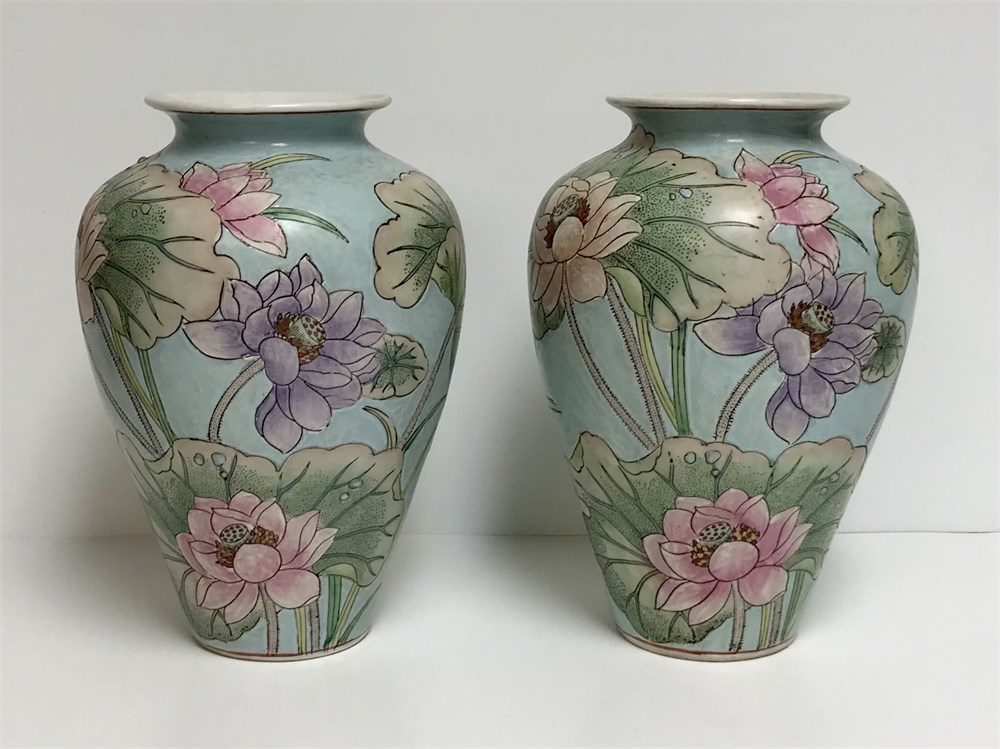 Hand-painted ceramic vases, very pretty.  Marked and labeled on the bottom; H.F.P. Macau.  No chips/cracks.