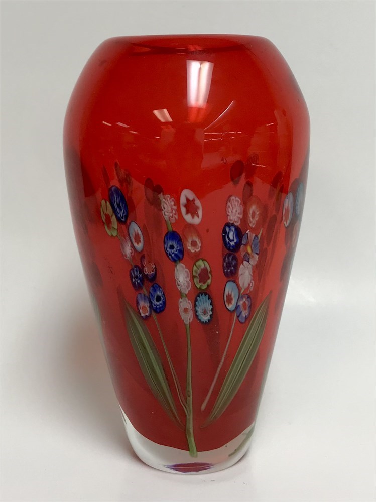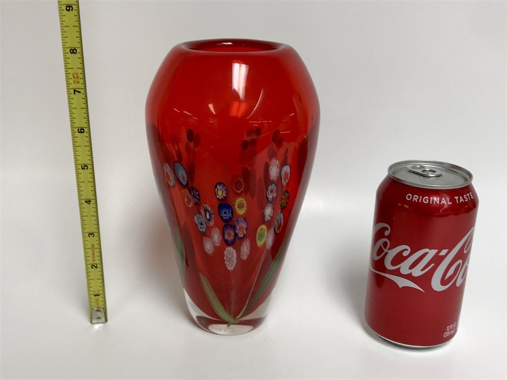 Bright red art glass with colorful flowers, no damage, thick heavy glass, about 8" tall.