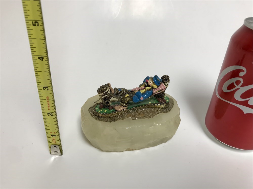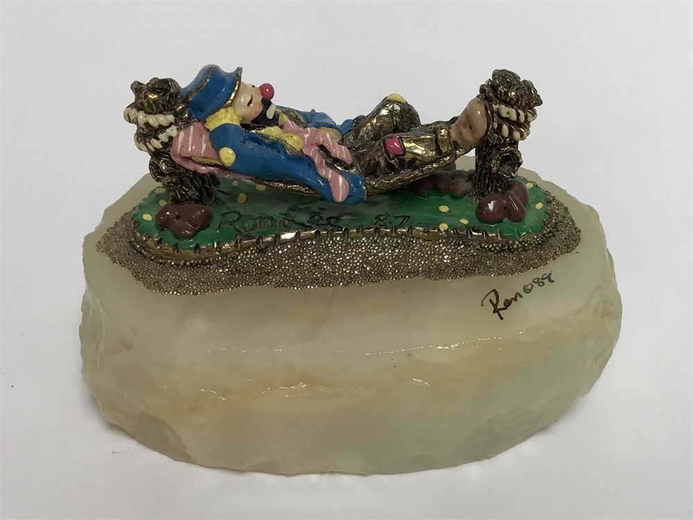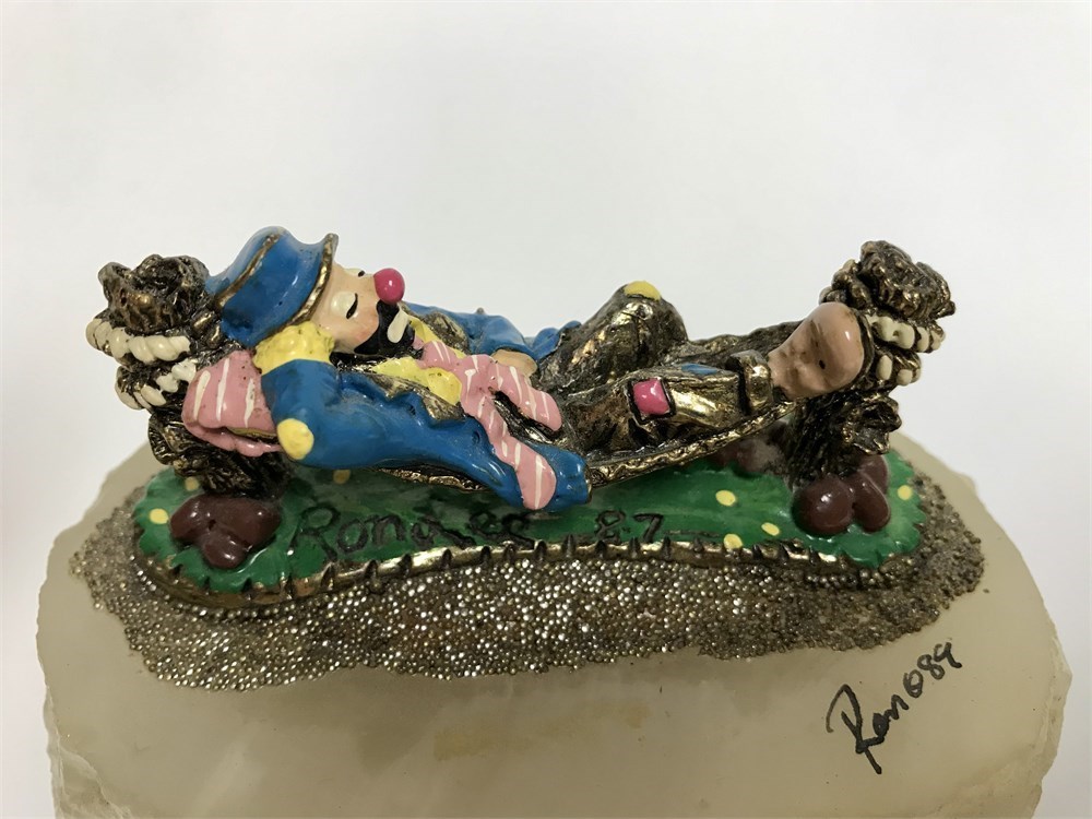 Small sculpture of a clown resting in a hammock, on a stone base.  Signed Ron Lee 87 on the sculpture, and signed Ron 89 on the stone.  Cute little collectible, about 3" tall.