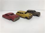 3 metal cars, unmarked; 1 Auburn rubber car; the other small ones are TootsieToy.  And a large metal truck (the man might go inside somehow as the driver?).  See photos for condition.