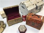 "Treasure Chest" style storage box for jewelry or small items.  2 metal (brass?) boxes.  Other small boxes for jewelry or trinkets/keepsakes.  Some are scuffed or have condition issues.  Selling all together.