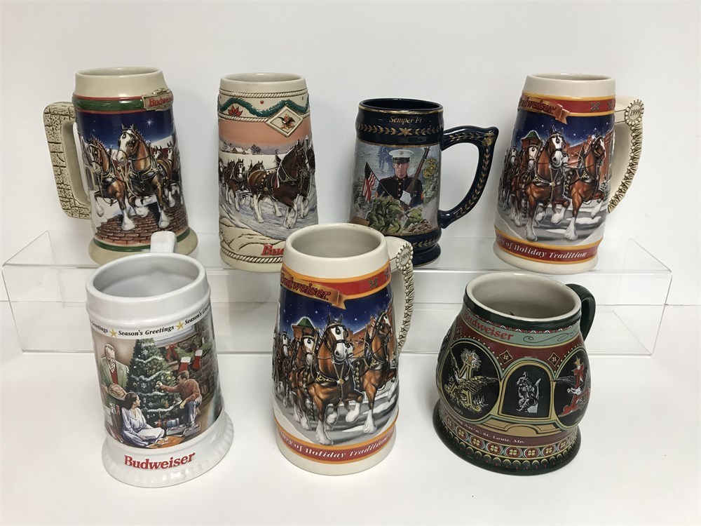1990's Budweiser collector issue steins, plus one is a Marine Corps stein.  The white Christmas one has damaged handle; others look good other than dusty.