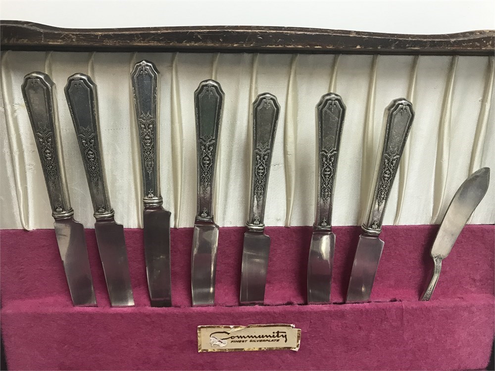 Estate flatware as found.  Marked 1847 Rogers Bros.; probably silver plated (not sterling); we believe it's the Ancestral pattern.  The box is in bad condition and the set has wear.  Completer utensils include tomato server, meat fork, more.