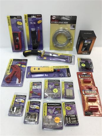 Packaged household items and tools and parts.  2 packages of cap gun shots.  A pocket video camera.  Useful stuff!