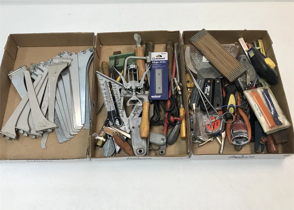 Shelf brackets, various small tools.  Chalk lines, pocket knives, square, small plane, ruler, many other things in the 3 boxes.  A lot of tools!