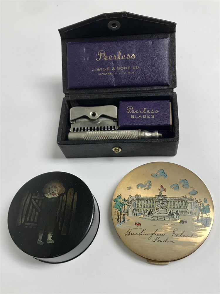 Lots to love about this vanity items lot.  A really nice Stratton mirrored compact, souvenir of Buckingham Palace, London; pouf included.  AND a really nice Peerless razor set including the original box and a pack of blades.  Plus, a small round painted box/tin.