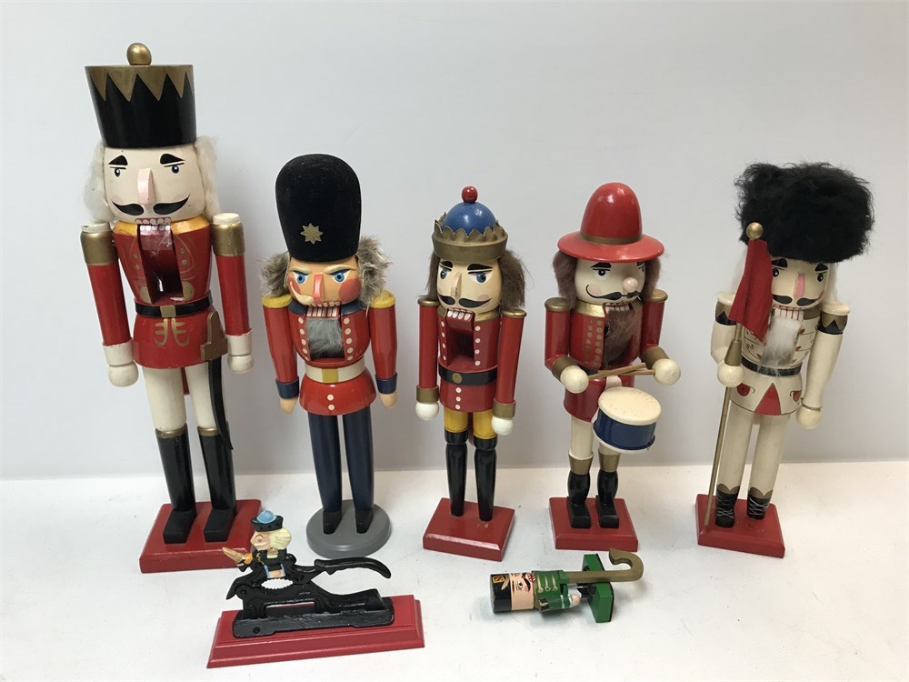 8"-12" Wood decorative nutcrackers, 1 small metal nutcracker, 1 stocking hanger.  Some may have condition issues, see photos.  All for the bid!
