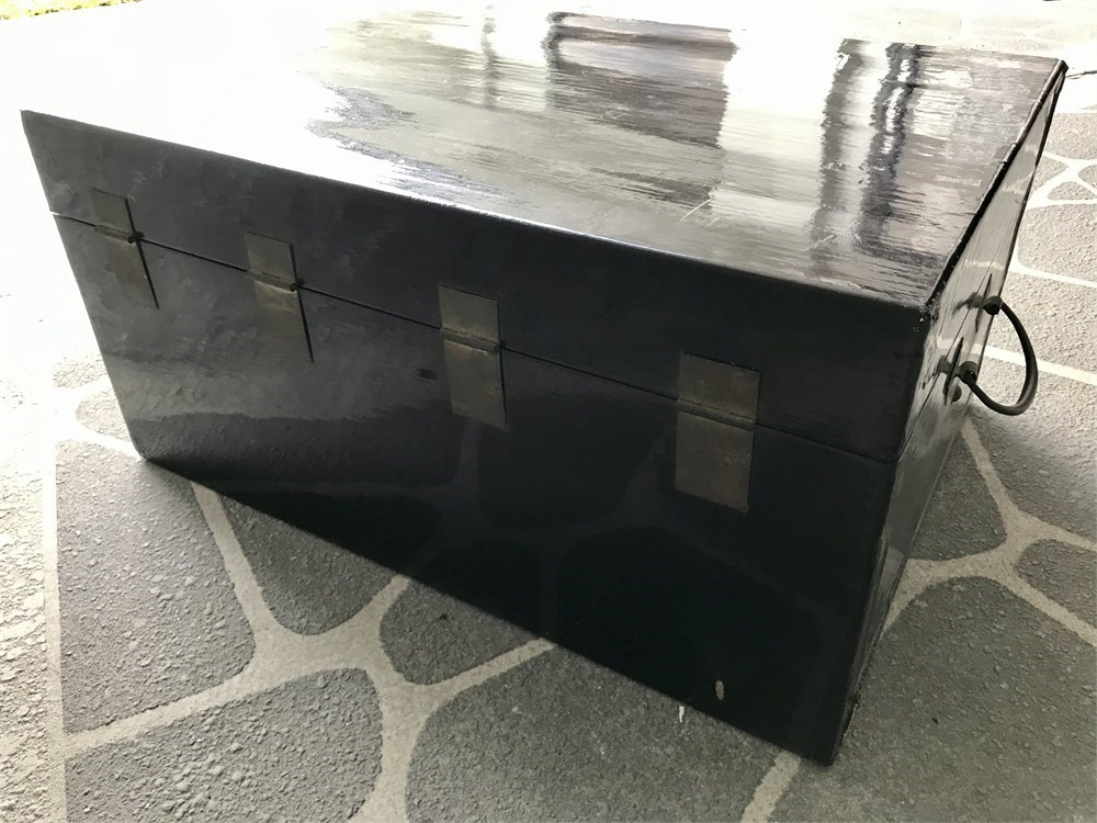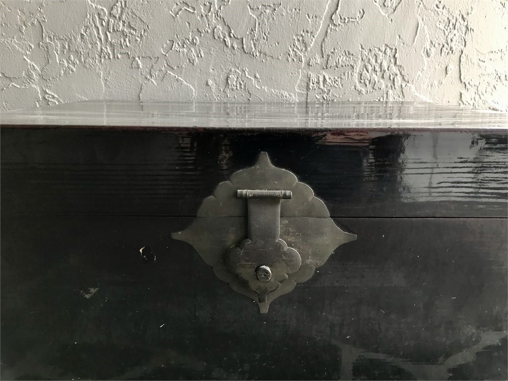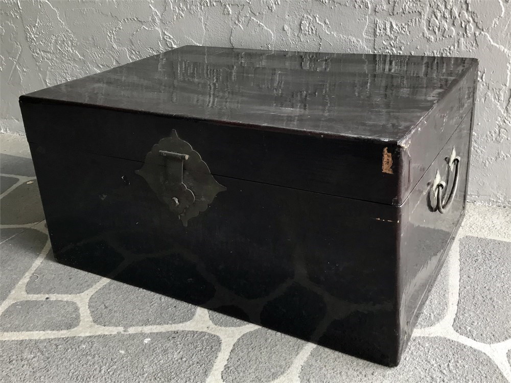 Lacquered wood trunk with metal hardware.  30" x 21.5" top, and 15" tall.