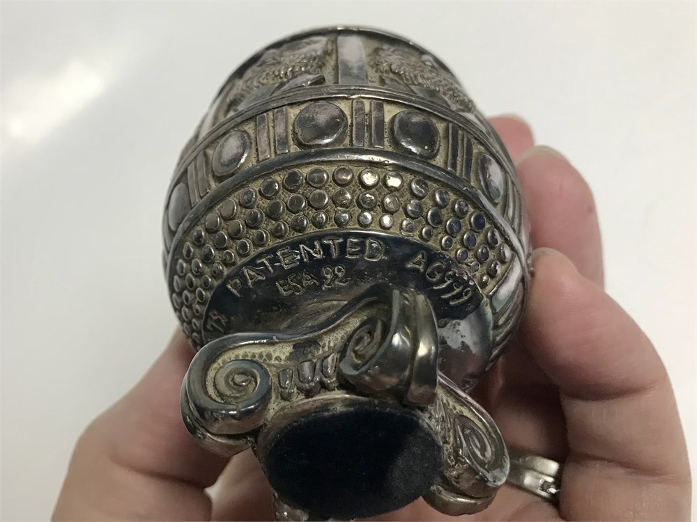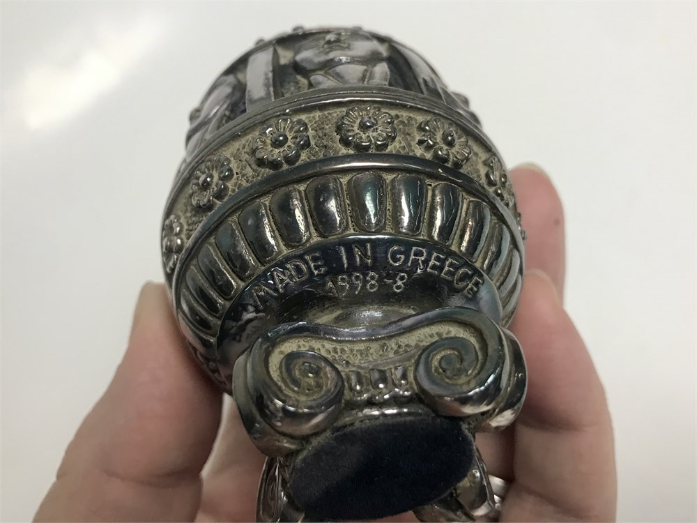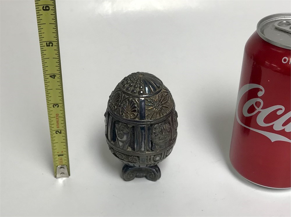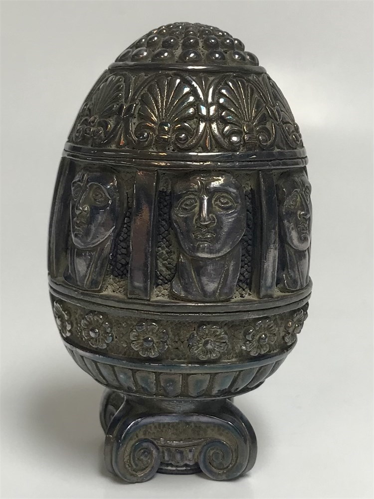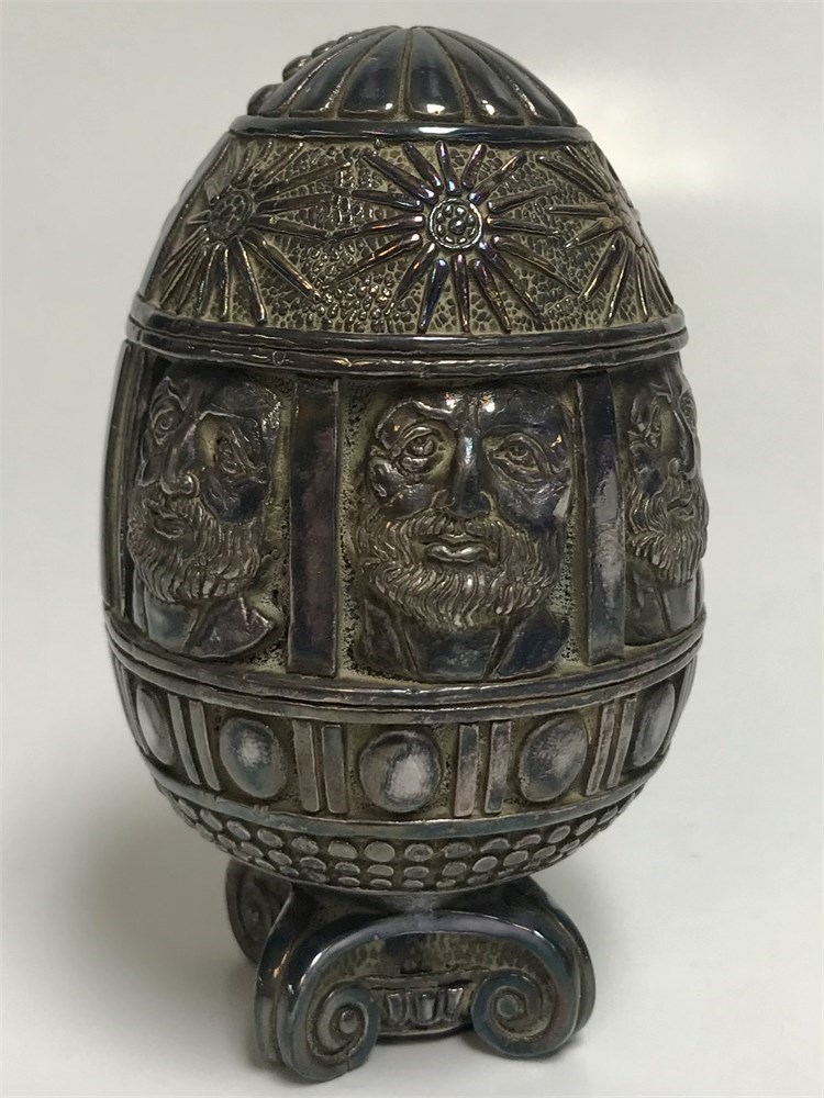 Made in Greece, a life sized egg with attached pedestal (all one piece).  Marked AG999 indicating 999/1000 silver, and referring to the exterior.  About 4" tall; having two different designs, front and back.