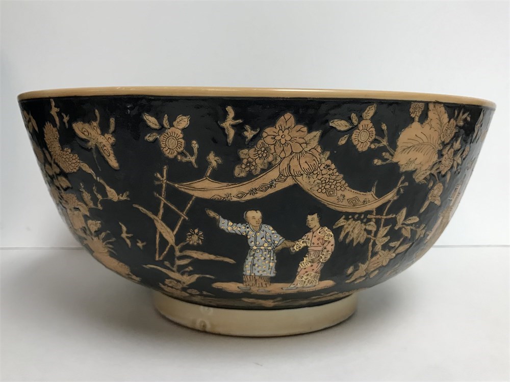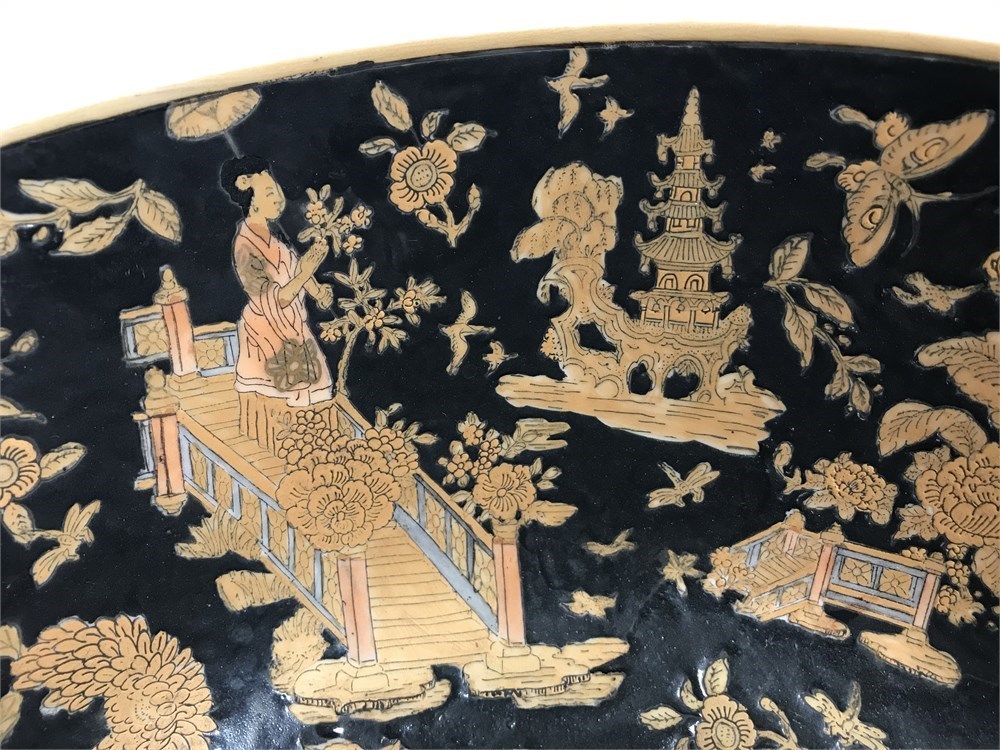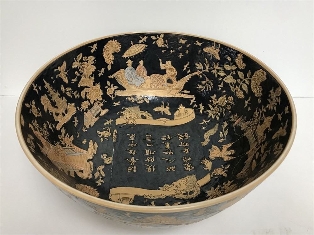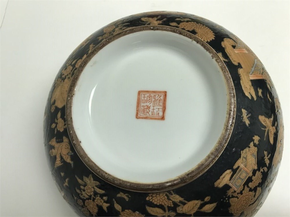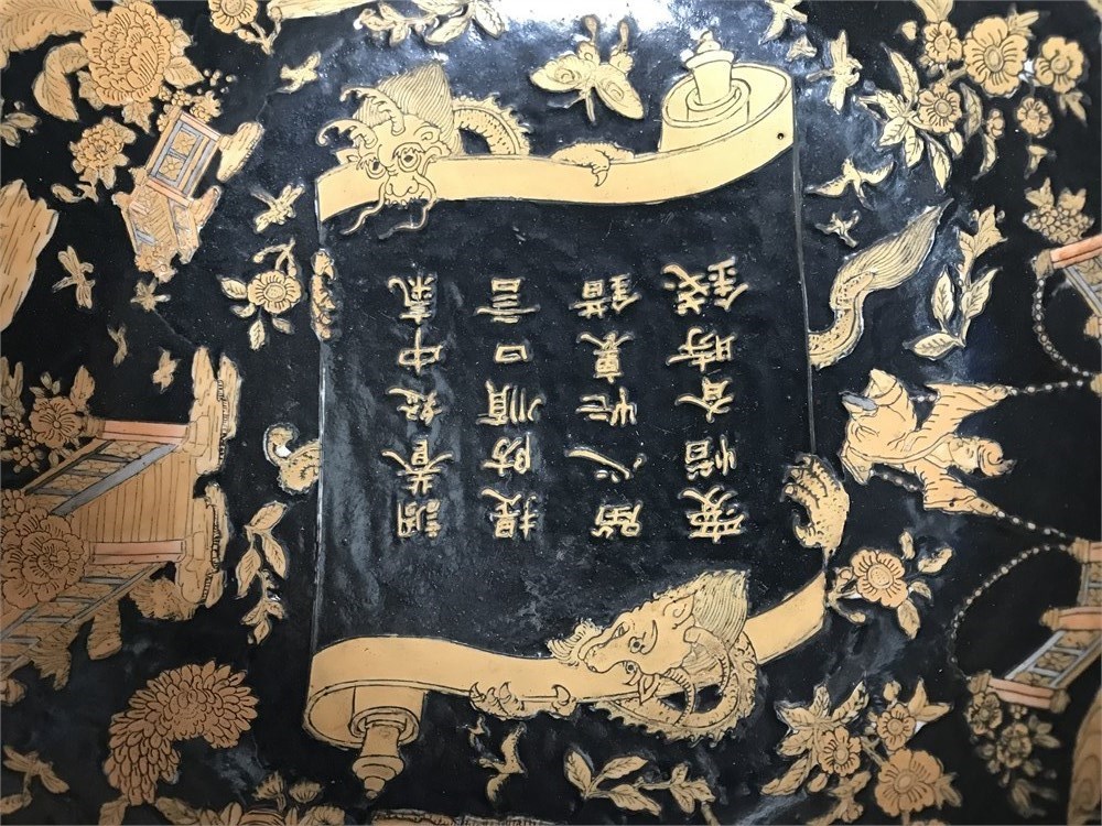 Good condition, with red stamp on the bottom.  Black background with many decorations, mostly muted/brown colors.  In the center is a scroll with writing.