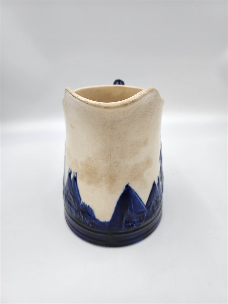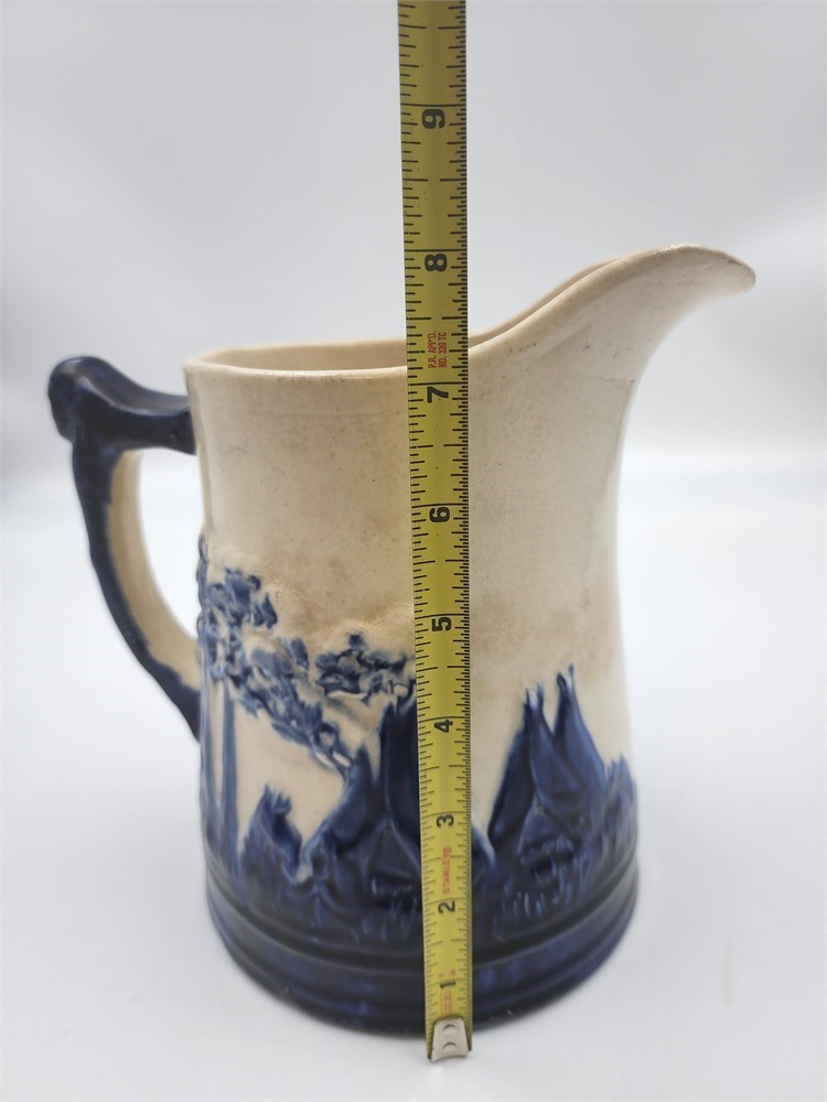This is a hard to find old early 1900's era blue and white glazed Sleepy Eye pottery pitcher.  Interior is crazed.  Exterior looks good with some light discoloration in areas.  Approx 7" to rim and 8 1/2" to top of spout.  For sure, no reproduction here!  This is a good old one.